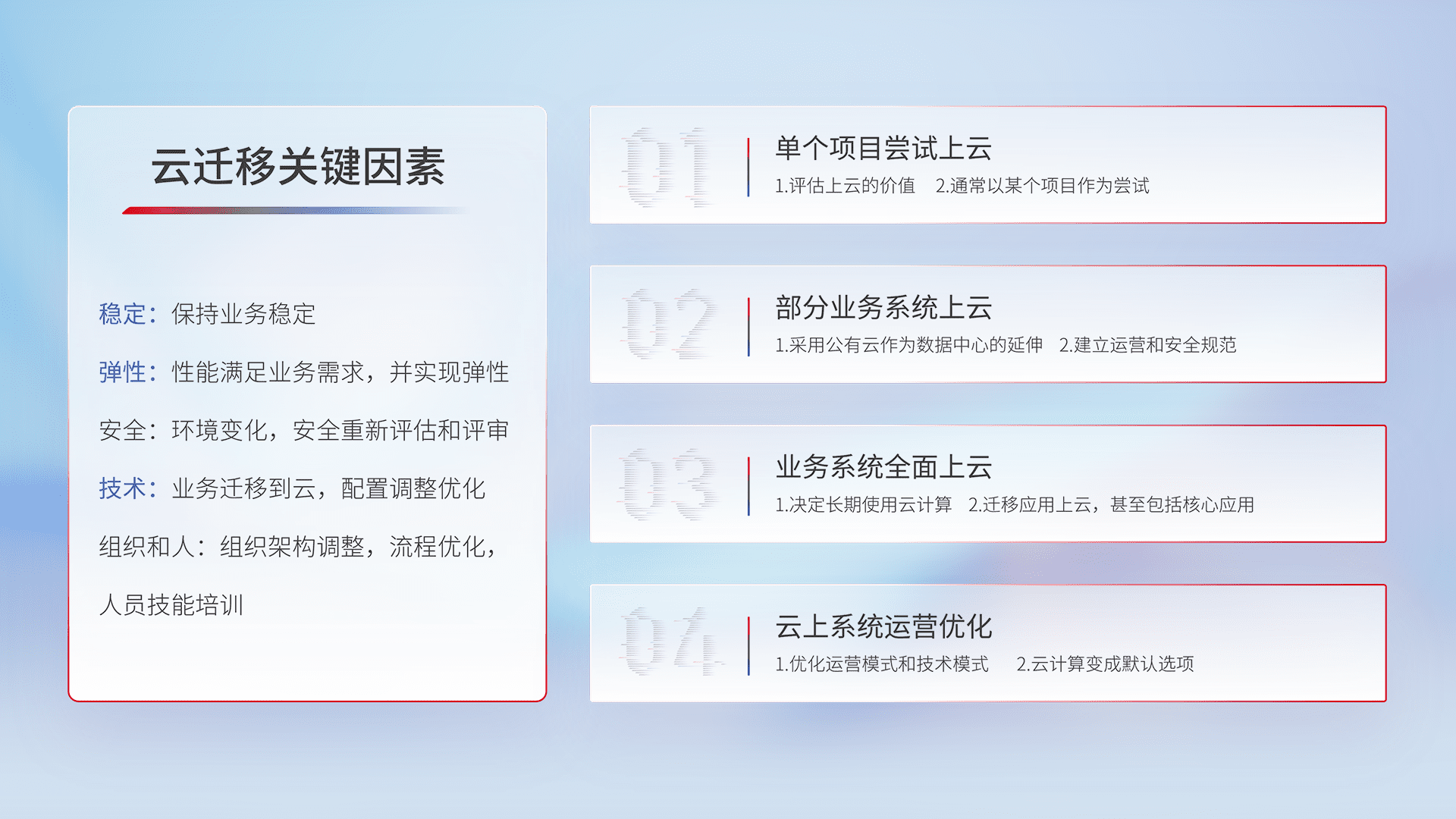 结合实际业务,,,从规划设计、、云平台选型、、、云原生改造、、、、数据迁移、、、集成交付,,迁移全过程为客户识别最佳上云路径,,,,做好风险识别管理,,,设计网络架构、、身份权限、、、、安全审计合规、、、操作审计、、、日志审计、、、监控告警策略、、、、多站点容灾设计等,,,对云上基础设施进行整体规划,,提升IT治理水平,,以满足弹性、、高可用、、、高性能的需求。。。